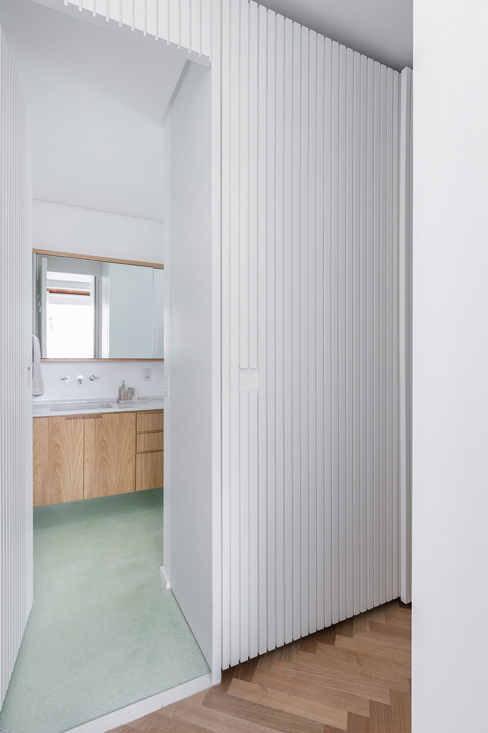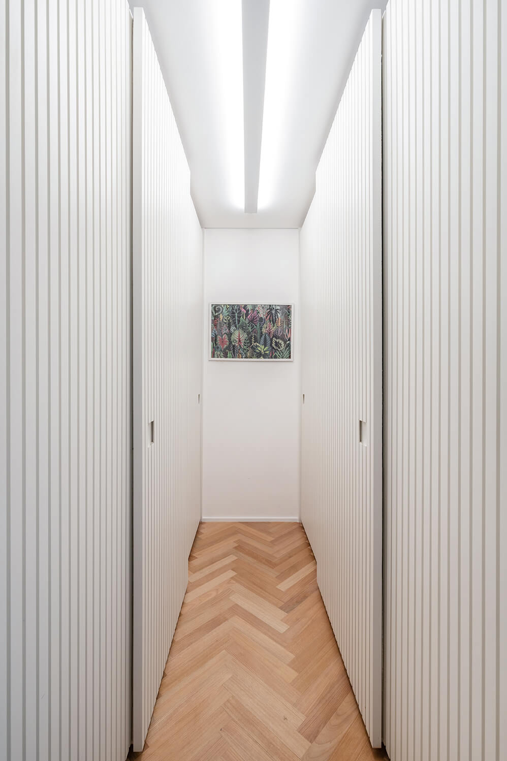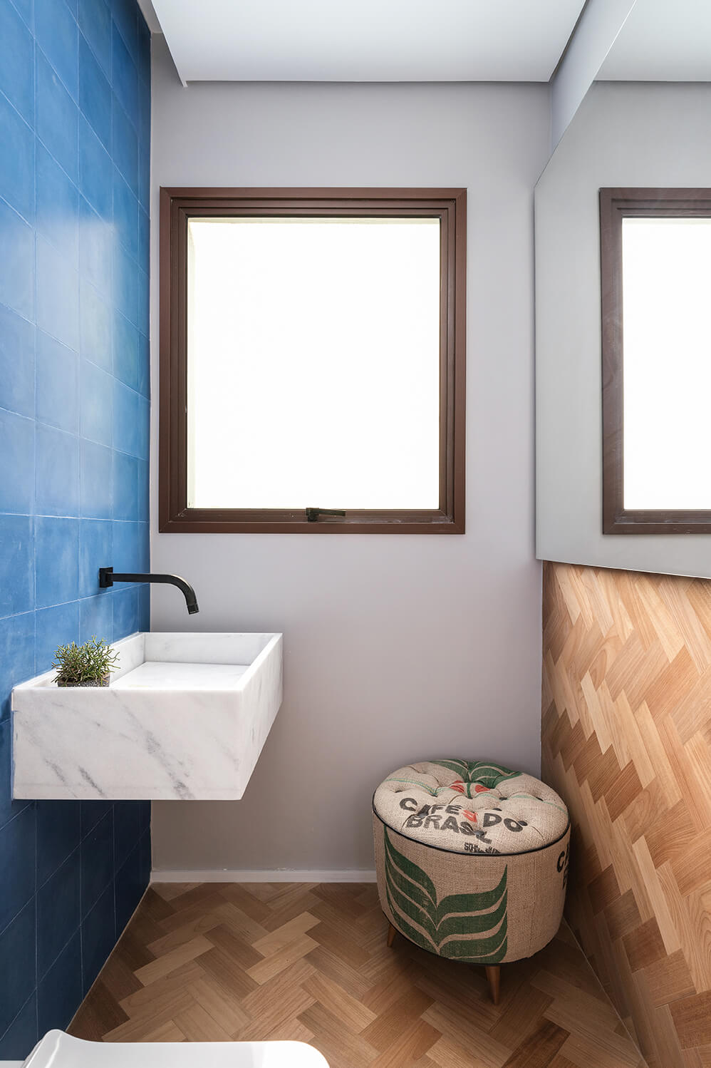 Outro destaque é o painel de azulejos no piso superior, utilizado no hall e no banheiro.