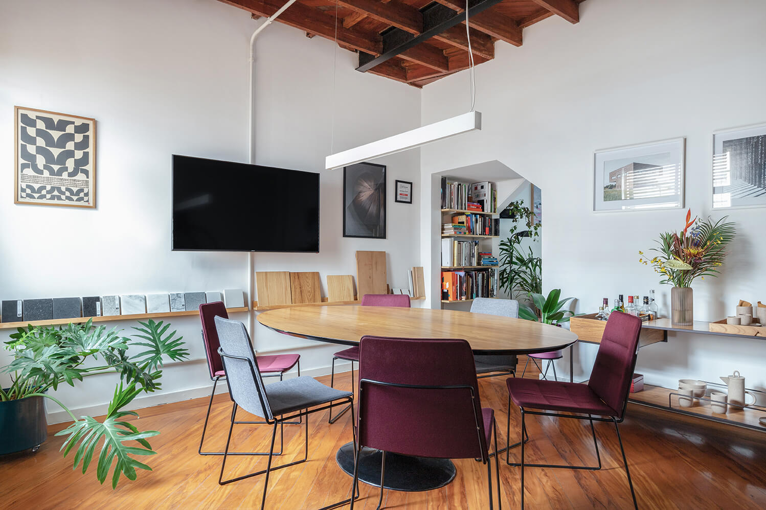 À noite, as luzes quentes iluminam o escritório e o bar do subsolo, se misturando à noite fria de São Paulo.